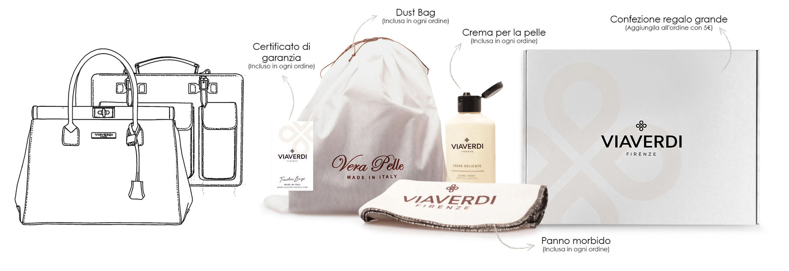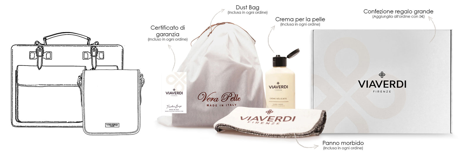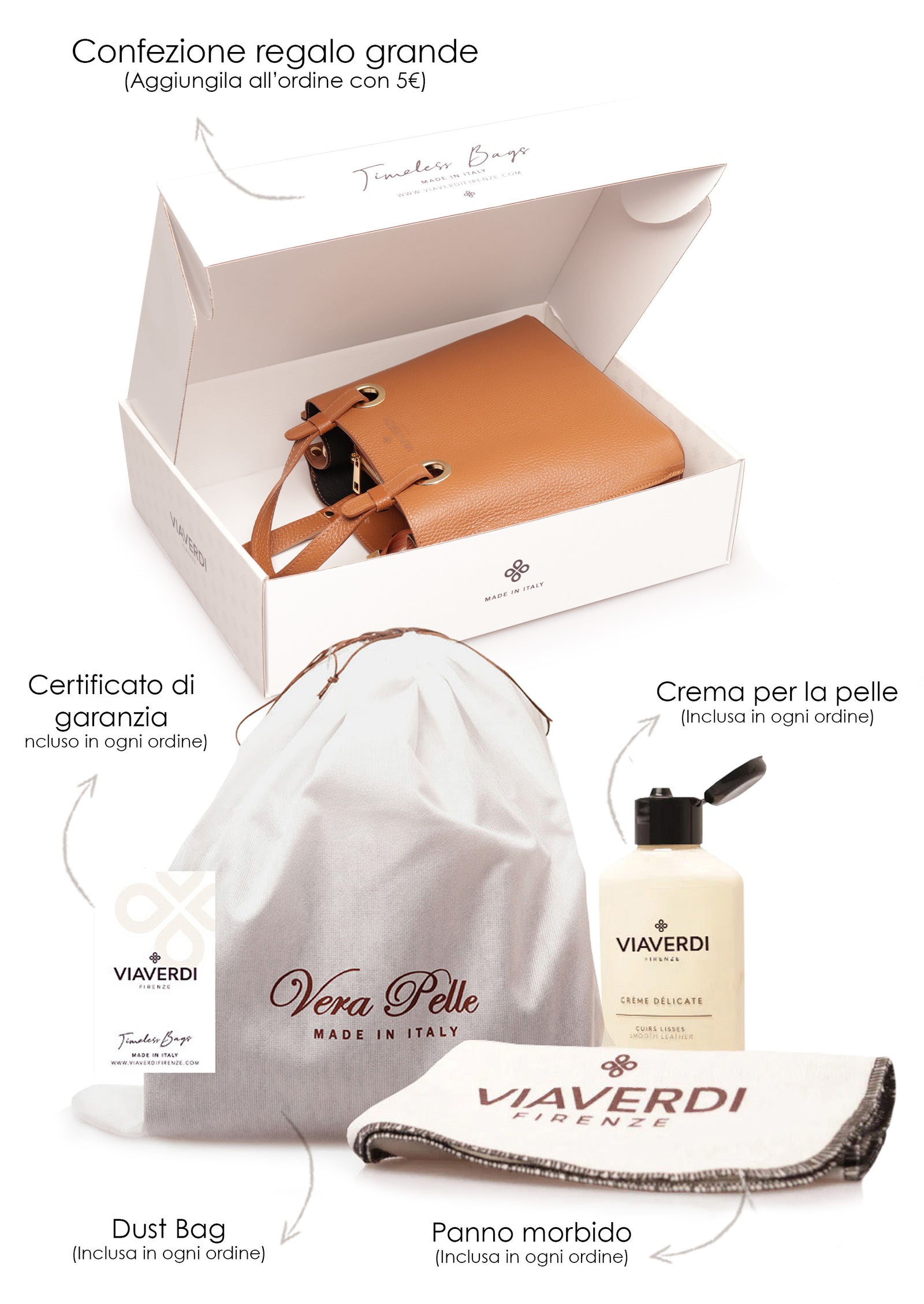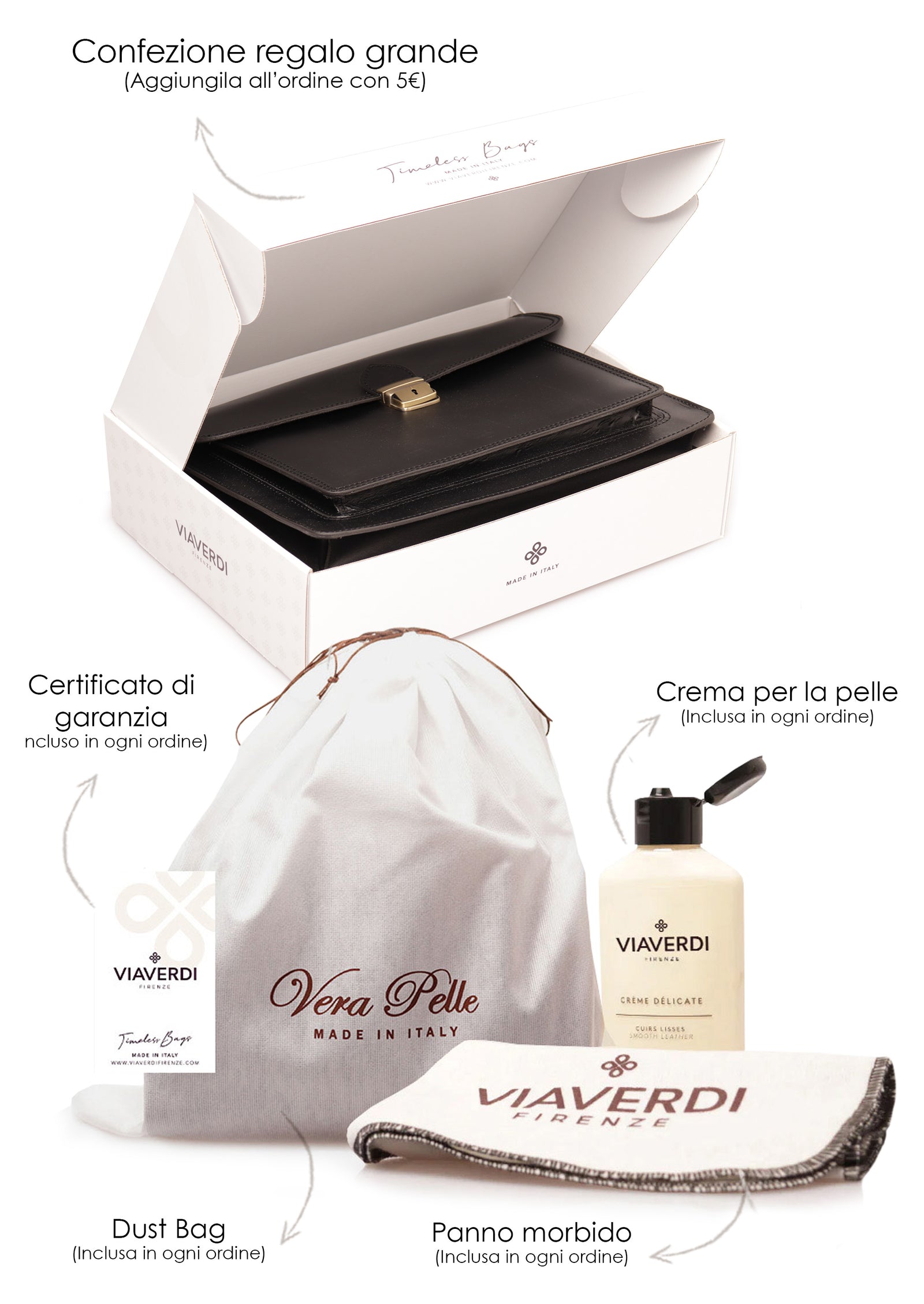 Im Paket für Damentaschen und Aktentaschen finden Sie als KOSTENLOSES GESCHENK das Set „Take Care Your Bag“: Staubbeutel, Creme und Tuch zur Pflege des Leders Ihrer Tasche. Wenn Sie möchten, können Sie mit einem kleinen Beitrag von 5 € die GROSSE Geschenkbox mit ViaVerdi-Logo erwerben