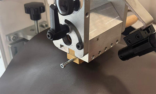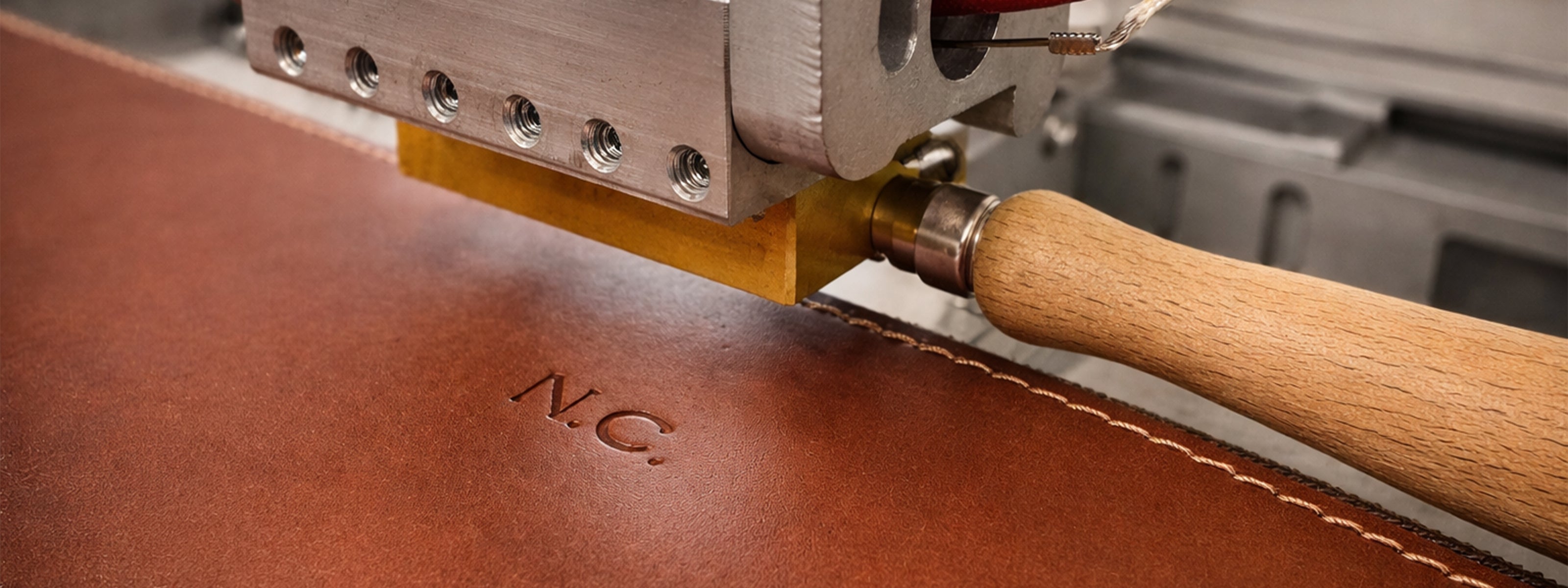 L'impressione a caldo è un'eredità artigiana che conosciamo bene. Il carattere viene scaldato alla temperatura giusta e pressato sulla pelle per pochi secondi: la fibra reagisce, si imprime, e il segno diventa parte della borsa. Non è una stampa che si stacca — è una traccia permanente.