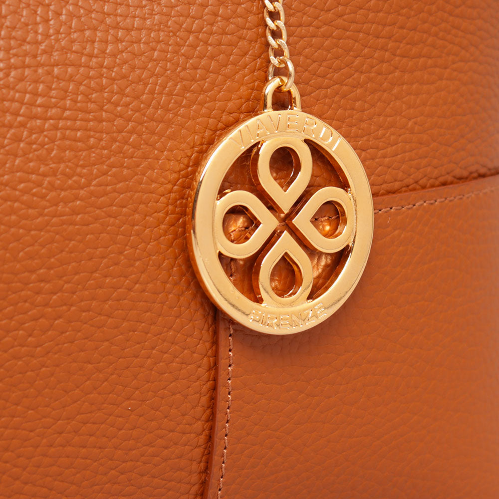 Il logo ViaVerdi stampato su un elegante pendente in ottone oro rende unica la nuova collezione, il pendente può essere rimosso e grazie al moschettone può essere applicato su qualsiasi aggancio della borsa. Le finiture metalliche color oro sono resistenti ad urti e usure danno un tocco di eleganza unico al prodotto, la parte frontale presenta un una elegante chiusura in bambù. L’ Interno è interamente foderato in 100% cotone altamente resistente e adatto a far respirare il pellame. La certificazione Made in Italy cucita direttamente all'interno che garantisce la provenienza del prodotto.